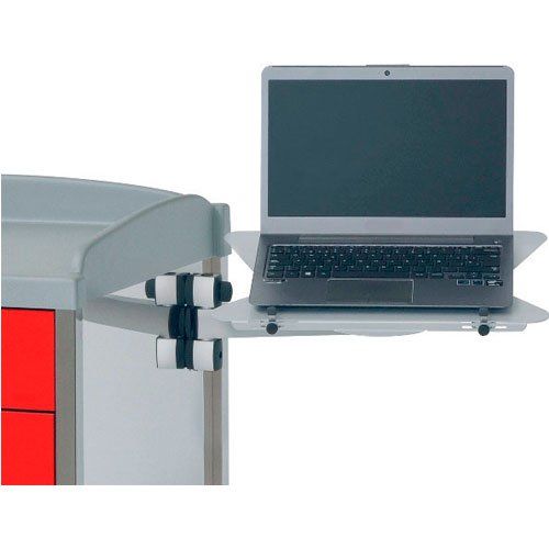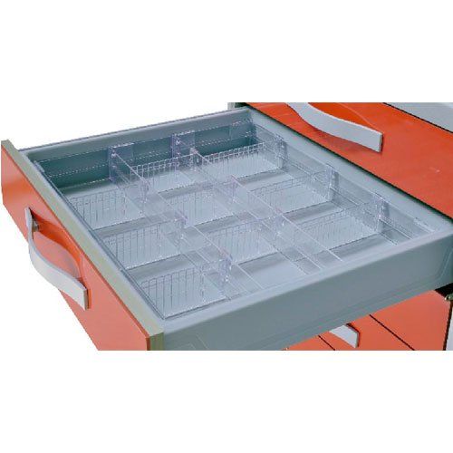 Carro medicación con 4 cajones con auto-cierre y 2 bandejas con 8 cajetines para medicación.